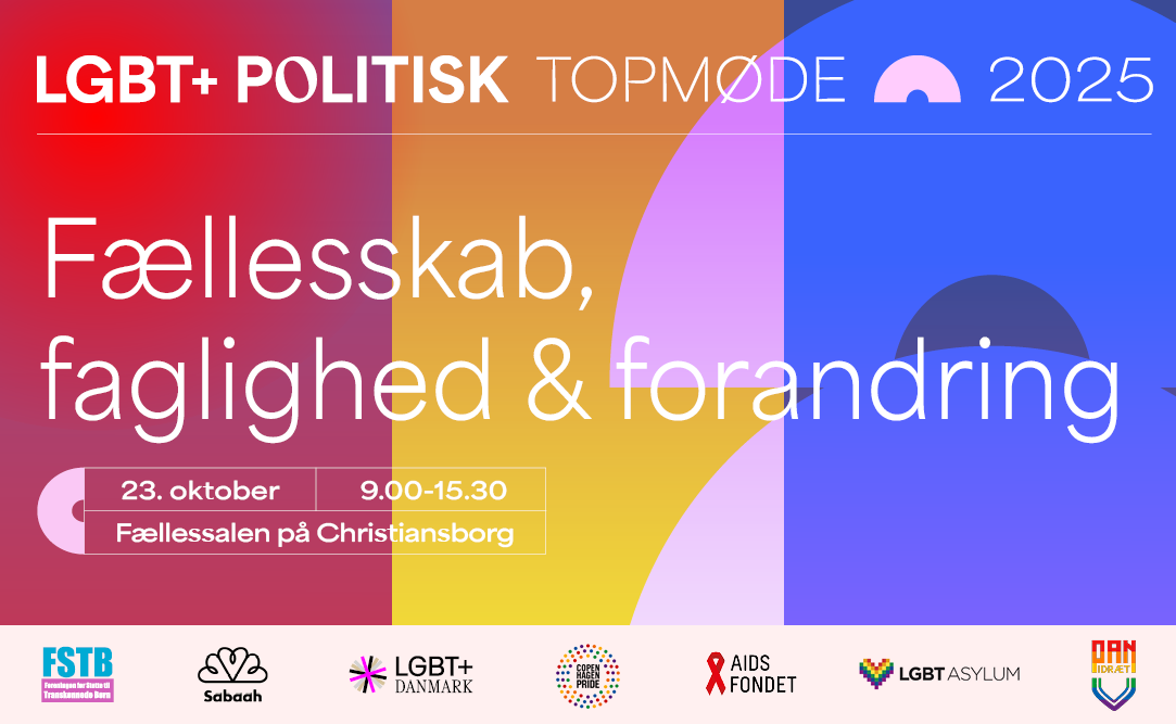 23. oktober flytter en række af Danmarks LGBT+ organisationer ind på Christiansborg for sammen med politikere og fagpersoner at diskutere de mest brændende spørgsmål på LGBT+ dagsordenen. Årets tema for topmødet er Fællesskab, faglighed og forandring.